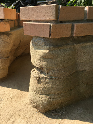 The bricks on the rammed earth wall not only perform slowing down the speed of rainwater flowing on the rammed earth wall but also provide a platform for fabric formwork for the phase 2 construction.